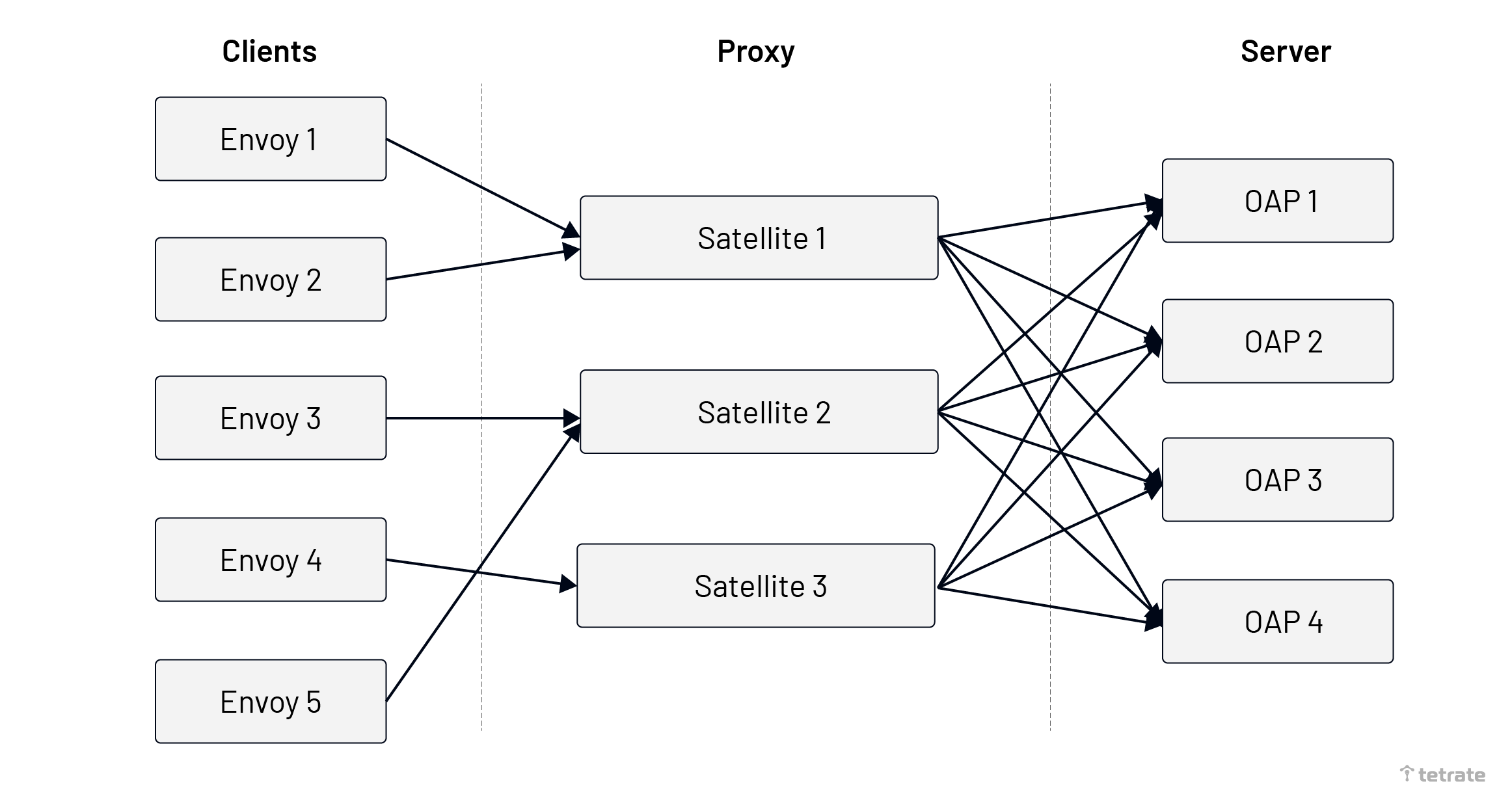 As shown below, a single client still maintains a connection with a single Satellite, Satellite would establish the connection with each OAP, and load balance message to the OAP node.