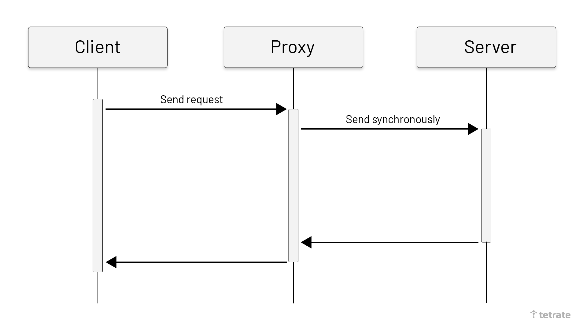 As shown below, after the client sends the request to the Proxy, the proxy would send the message to the server synchronously. When the proxy receives the result, it returns to the client.