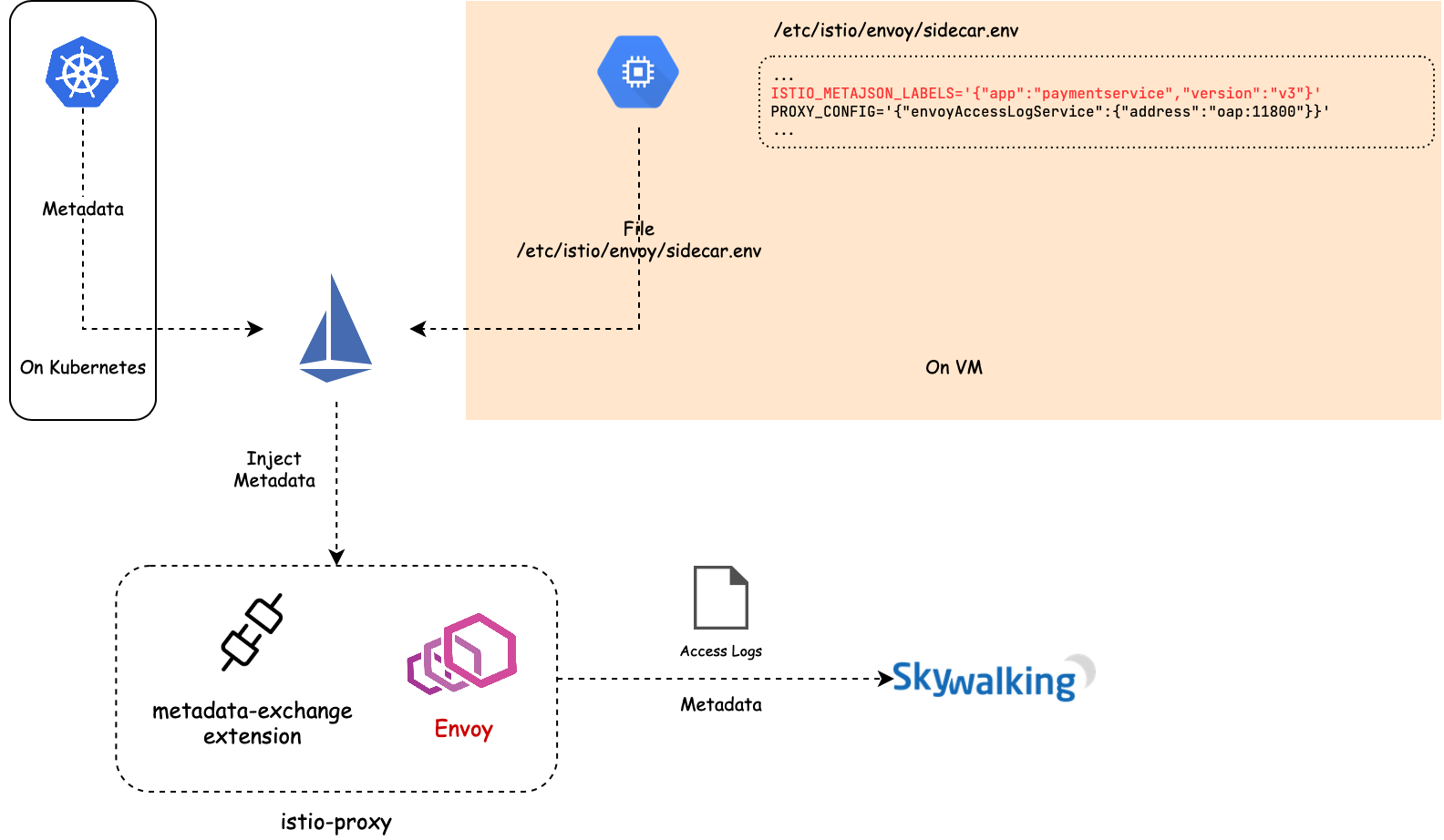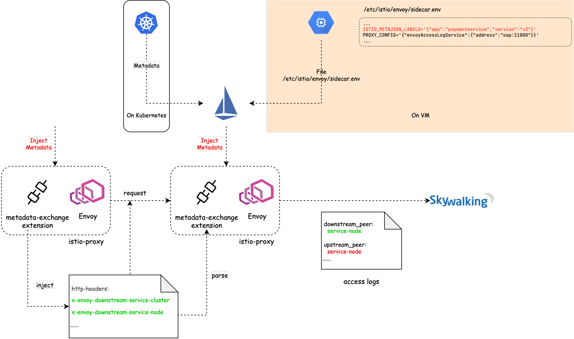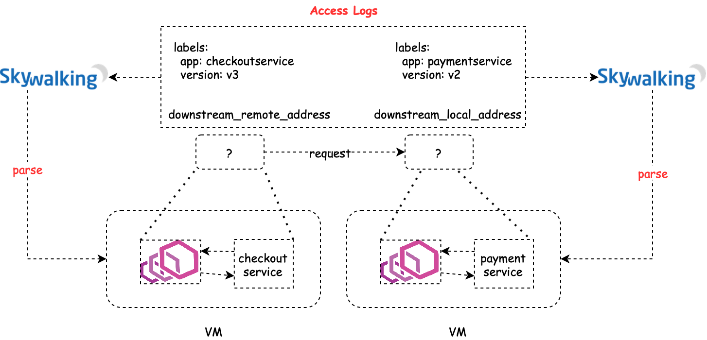 The basic idea we present in this article is to carry the metadata along with Envoy’s access logs, which is called metadata-exchange mechanism in Envoy. When Istio pilot-agent starts an Envoy proxy as a sidecar of a service, it collects the metadata of that service from the Kubernetes platform, or a file on the VM where that service is deployed, and injects the metadata into the bootstrap configuration of Envoy. Envoy will carry the metadata transparently when emitting access logs to the SkyWalking receiver.