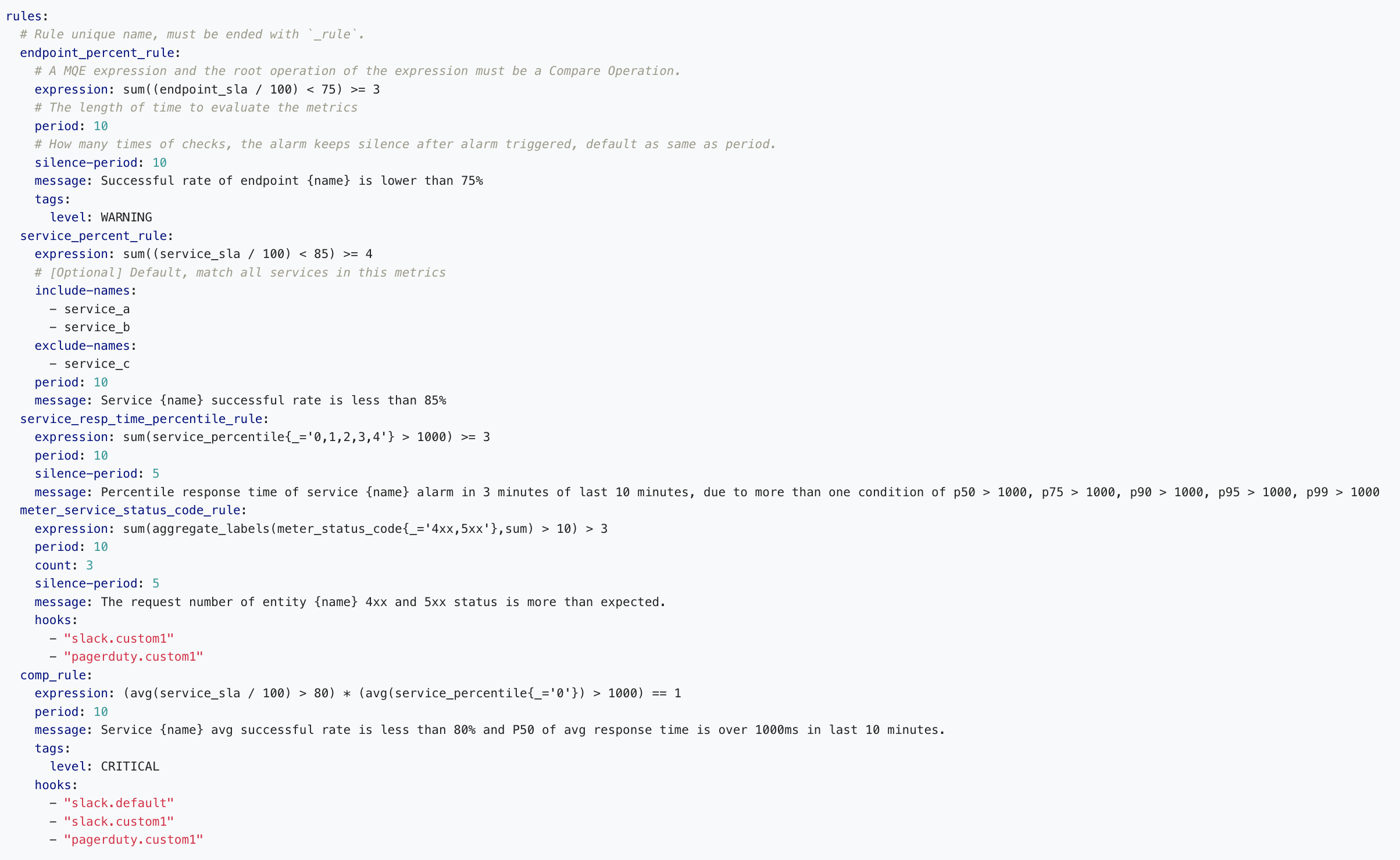 serviceRelationin MAL by adding settings for thedelimiterandcomponentfields. - [Breaking change] Support MQE in the Alerting. The Alarm Rules configuration(alarm-settings.yml),