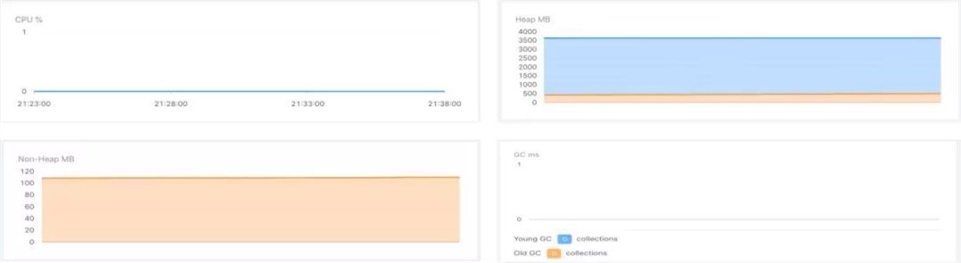 还可以监控到Service运行时的CPU、堆内存、非堆内存使用率、以及GC情况。这些信息来源于JVM。注意这里的数据可不是机器本身的数据。