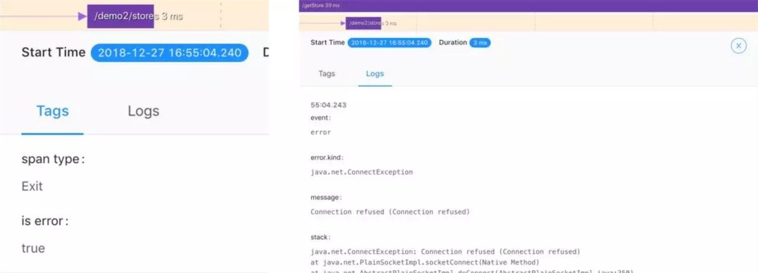 发生错误的调用链中Span中的is error标识变为true,并且在名为Logs的TAB中可以看到错误发生的具体原因。根据异常情况我们就可以轻松定位到影响业务的具体原因,从而快速定位问题,解决问题。