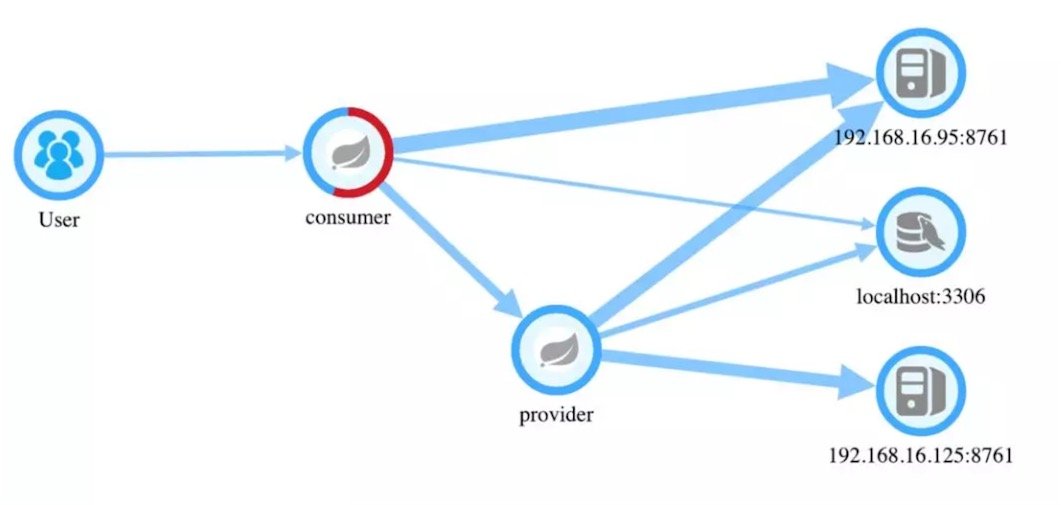 一个系统的拓扑图让我们清晰的认识到系统之间的应用的依赖关系以及当前状态下的业务流转流程。细心的可能发现图示节点consumer上有一部分是红色的,红色是什么意思呢?